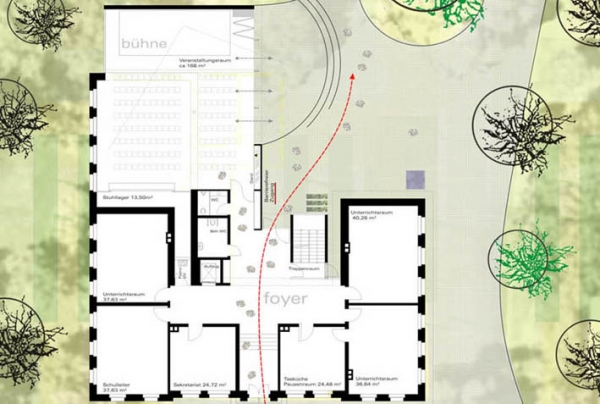 Die Musikschule Korntal, ein Backsteinbau aus der Jahrhundertwende wird saniert und um einen Veranstaltungssaal erweitert. Hierzu wird die gesamte Erschließung des Gebäudes umstrukturiert. Es wird ein Konzept zur Umsetzung in mehreren Bauabschnitten erstellt.